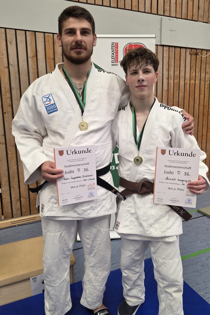 Robin hatte zwei Kämpfe zu absolvieren, Lennart trat im 5er-Pool Jeder gegen Jeden an. Der Nachwuchs musste also zwei Kämpfe mehr austragen als der Senior, was zu der kuriosen Situation führte, dass Robin während Lennarts Kampfpausen seine eigenen Kämpfe hatte. Die „Doppelbelastung“ managte der Routinier jedoch lässig und souverän und schnappte sich erneut Gold und Titel. Auch Lennart blieb in vier anspruchsvollen Kämpfen nervenstark und fokussiert und belohnte sich damit mit Platz 1 und dem Titel des Stadtmeisters 2025 in der U18.